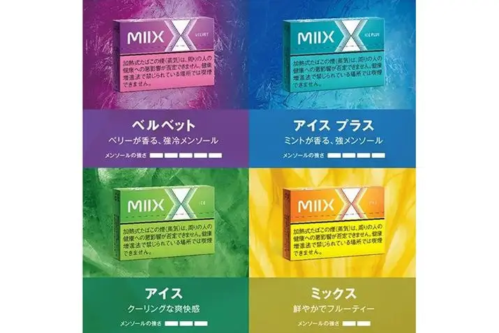 「릴 하이브리드」 전용 담배 스틱 「믹스(MIIX)」는 「벨벳」, 「아이스」, 「아이스 플러스」, 「믹스」 총 4종으로 구성된다. 가격은 20개입 510엔(세금 포함)이지만 별매 리퀴드 카트리지(60엔)도 필요하다.