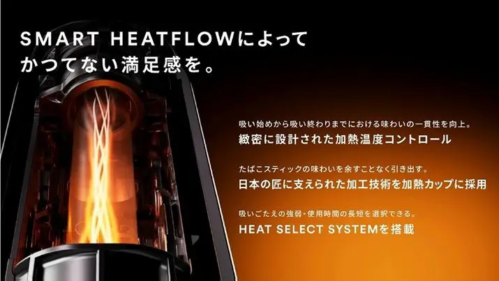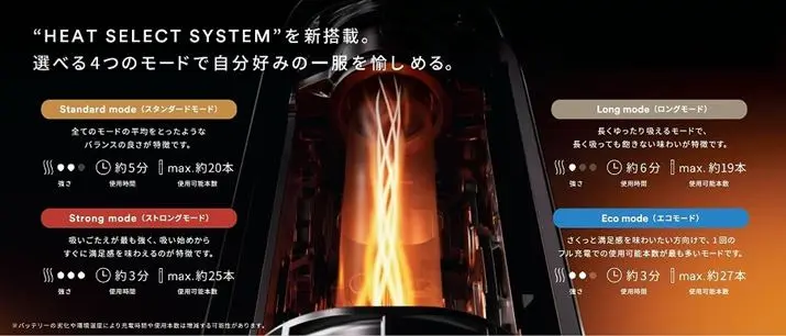 더불어 “히트 셀렉트 시스템(HEAT SELECT SYSTEM)”도 매력적인 기능으로, 가열 모드를 통해 담배의 맛과 흡입감을 변경할 수 있다. 이로 인해 담배 1개비당 사용 가능 시간이 최대 약 6분, 개비는 최대 약 27개비까지 흡연할 수 있게 되었다.