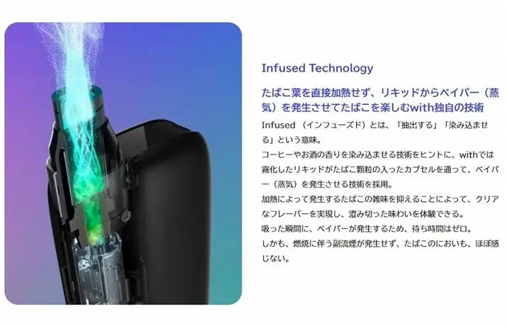 분무화된 액상이 담배 입자가 들어 있는 캡슐을 통과함으로써 맛과 향의 증기를 발생시키는 독자적인 '인퓨즈드 테크놀로지'를 채택