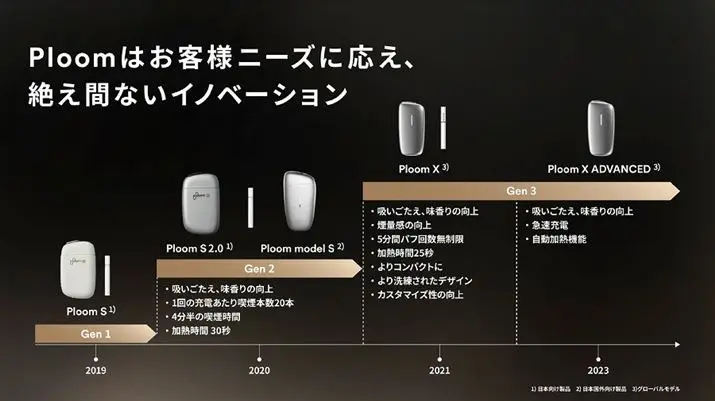 고온 가열식 ‘플룸’ 시리즈 1~3세대의 진화 과정. 참고로 '플룸'은 냄새가 적다는 점에서 경쟁사를 압도하는 높은 평가를 받고 있다