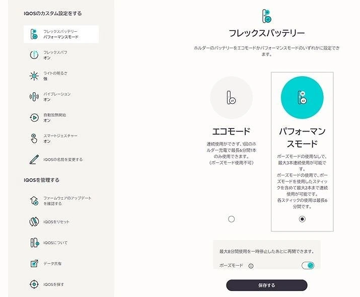 세 번째는 ‘플렉스 배터리’. 선호하는 스타일에 맞춰 홀더 배터리를 두 가지 모드 중 선택할 수 있는 기능으로, ‘아이코스 앱’(공식 사이트에서 접속)과 본체를 블루투스 또는 USB 케이블로 연동하면 앱에서 ‘퍼포먼스 모드’ 또는 '에코 모드'를 선택해 설정할 수 있다.