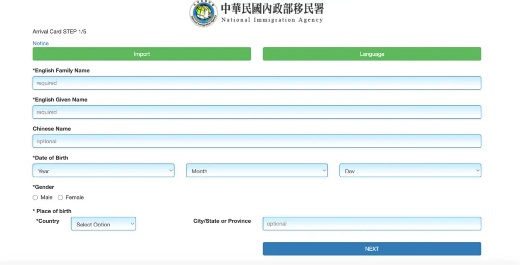 | Expect Arrival Date | 대만 입국일. 생년월일 입력과 마찬가지로 년, 월, 일 순으로 기재합니다. |
