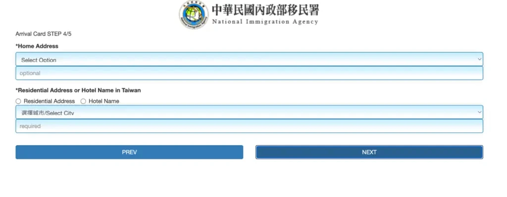 | Residential Address or Hotel Name in Taiwan | 대만에서 머무를 곳을 기입한다. 친구의 집에 묵는다면 'Residential Address'를 선택하고 주소를 기입합니다. 호텔에 묵는다면 'Hotel Name'을 선택하고 호텔 이름을 입력합니다. |
