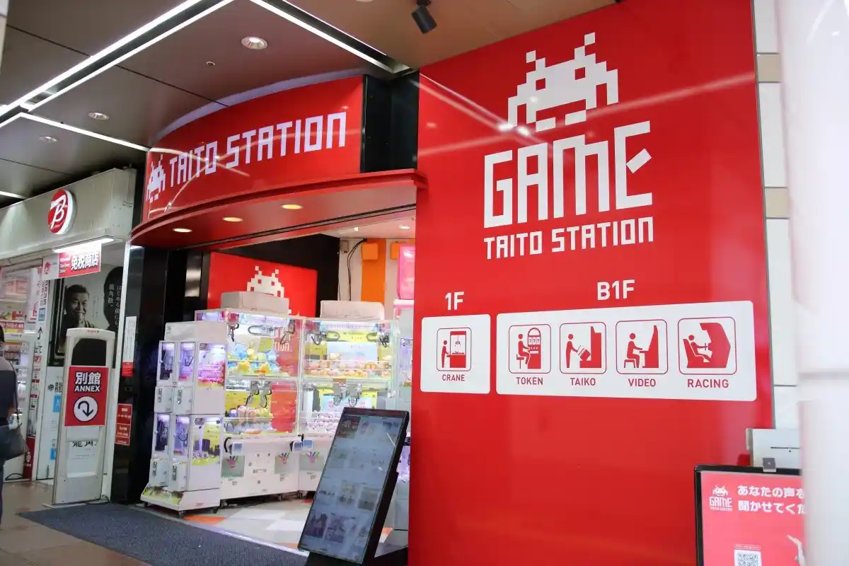 신주쿠역 동남구에서 도보 약 1분, 빨간 인베이더 마크의 간판이 눈에 띄는 ‘타이토 스테이션 신주쿠 남구 게임 월드’. 간판이 눈에 띄기 때문에 처음 방문하는 관광객도 쉽게 찾을 수 있습니다.