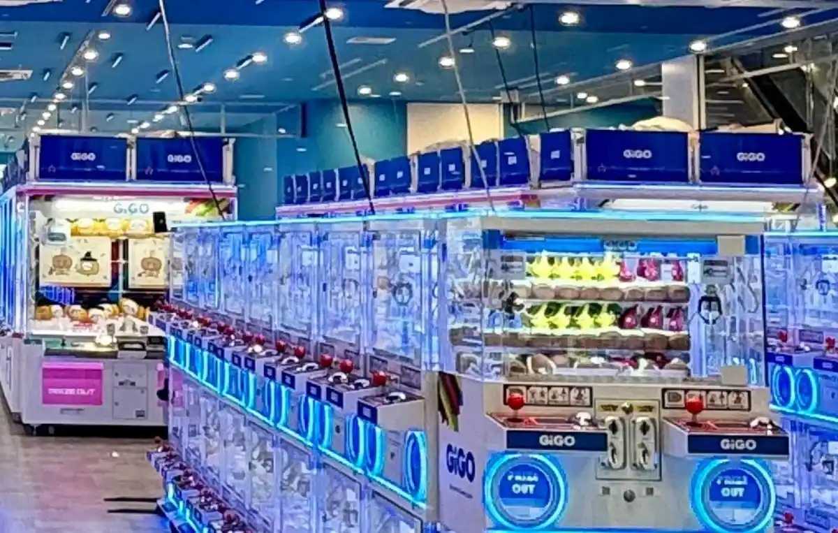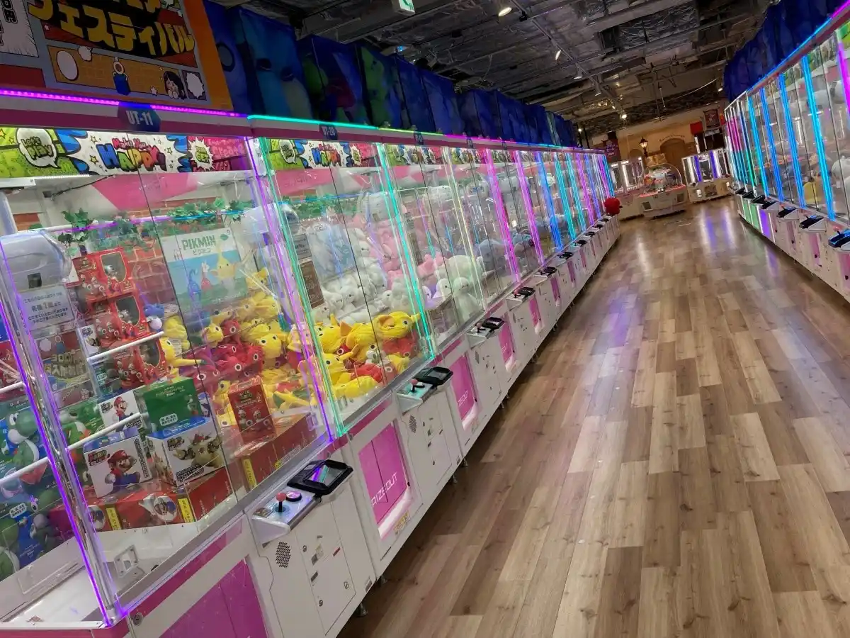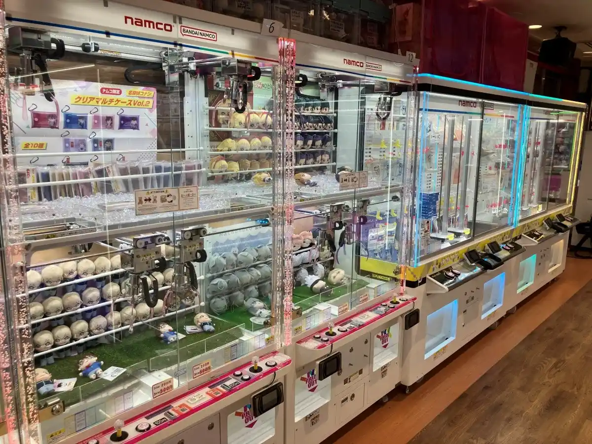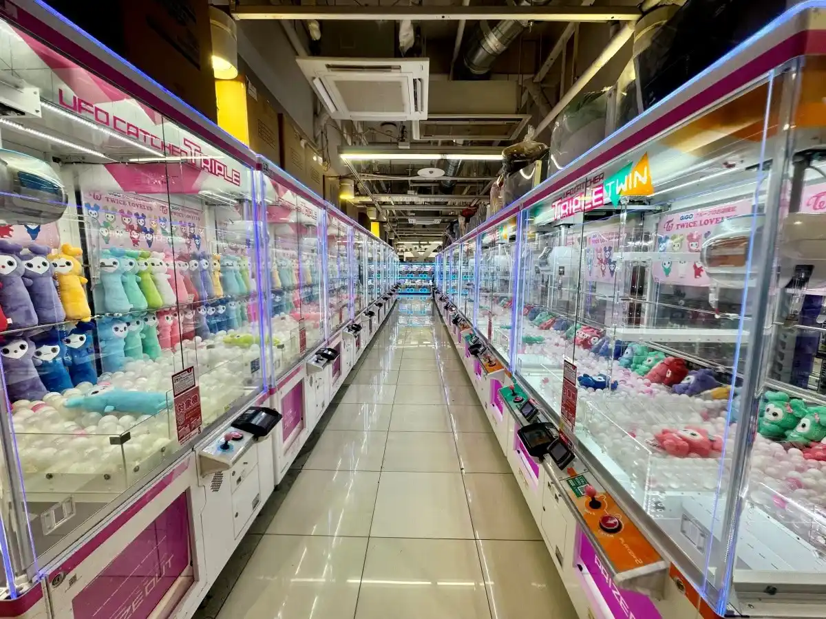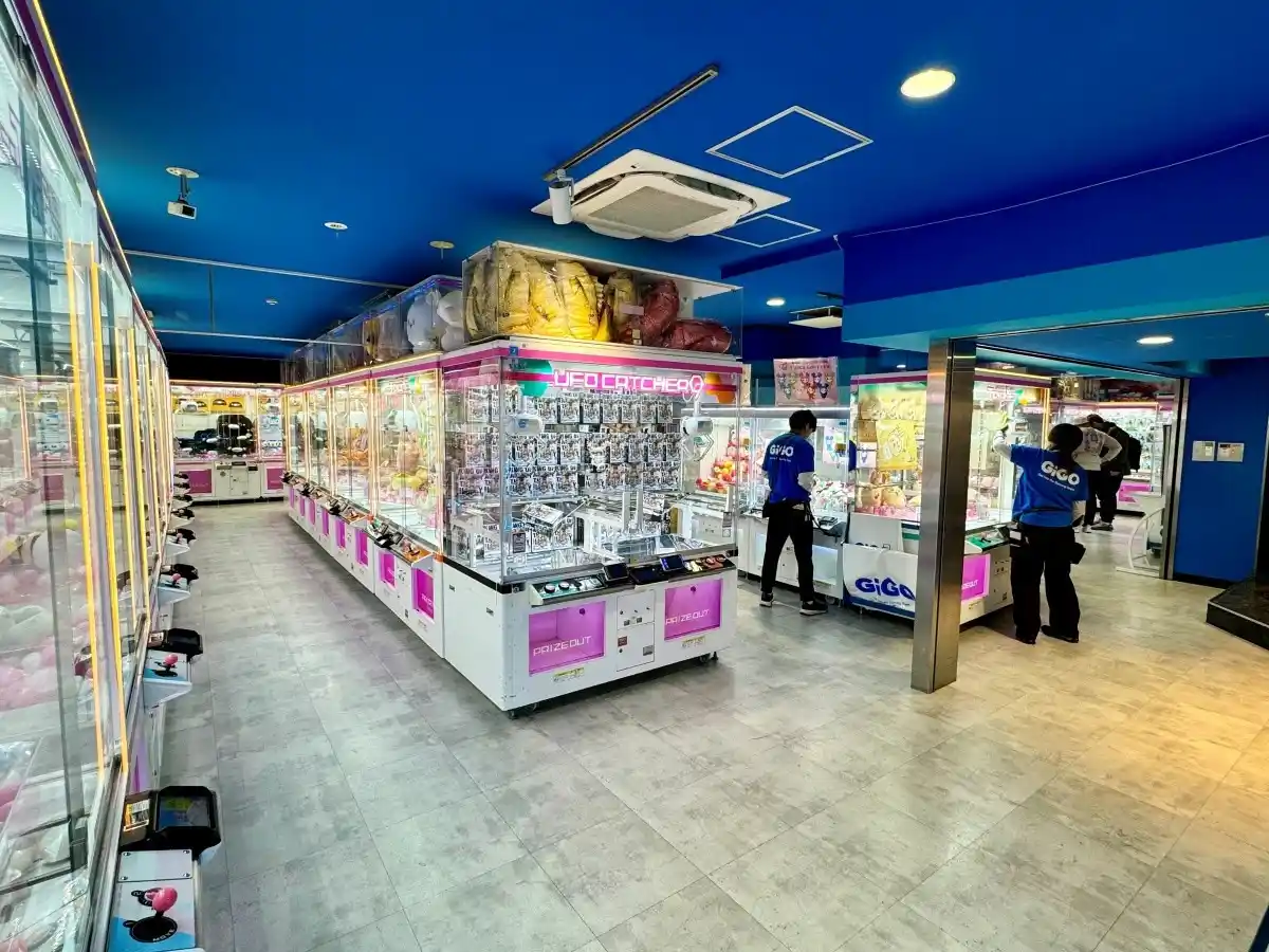 인형 등을 획득할 수 있는 크레인 게임 기기가 많습니다. 인기 있는 크레인 게임 기기는 3종류입니다. 키링, 캔 배지, 마스코트 등 소형 잡화류가 들어 있는 ‘GiGO 미니 크레인’, 전통적인 인형이나 피규어 등을 두 개의 암으로 획득하는 ‘UFO 캐처 9’, 대형 인형을 세 개의 암으로 잡는 'UFO 캐처 트리플'이 인기입니다.