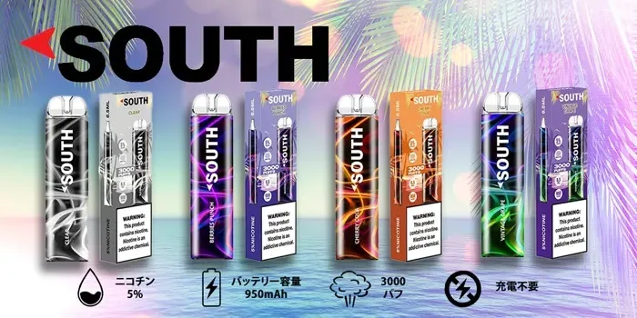 다음으로 소개하는 니코틴 함유 전자담배·VAPE 추천 순위 13위는 “SOUTH”입니다. 농밀한 증기를 즐길 수 있는 메쉬 코일을 채택한 일회용 모델로, 1개당 약 3,000회 흡입이 가능합니다.