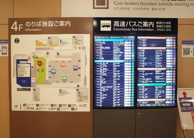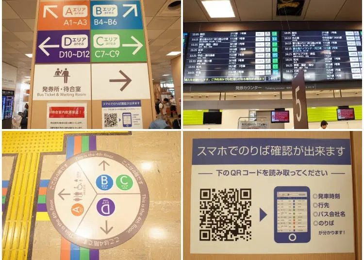 4층의 승차장은 크게 4개의 구역으로 나뉘어져 있습니다. 대기실로부터 가장 먼 곳이 간사이, 북륙 방면으로 가는 D구역 승차장이므로, D구역에서 출발하는 버스를 이용할 경우 시간에 여유를 두는 것이 좋습니다.