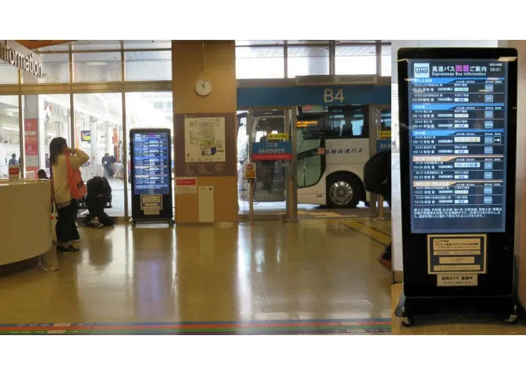 당일 버스 운행 상황, 시간표 등은 정보 안내 카운터에 있는 태블릿 단말기로 검색 가능합니다 (단말기는 영어, 간체자, 번체자, 한국어 대응).