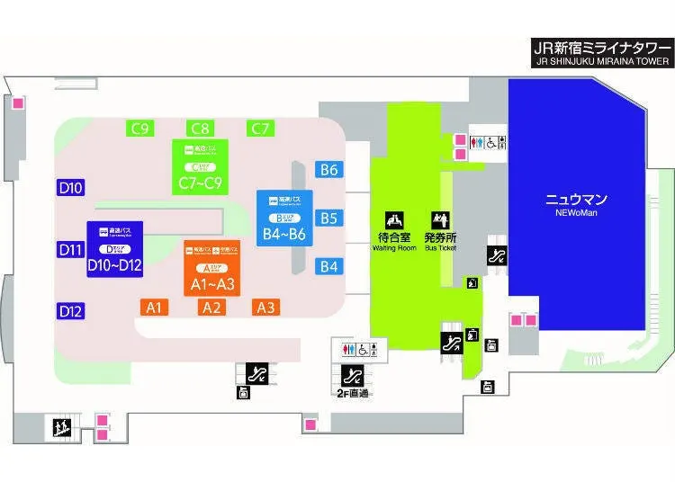 JR 신주쿠역 ‘신남’ 개찰구에서는 직결되어 있습니다. JR 신주쿠역 ‘남구’ 개찰구에서는 개찰구 앞 횡단보도를 건너면 바로 앞에 있습니다. 버스 승차장은 4층(공항행 등 일부 노선은 3층에서 출발합니다). 1층과 2층은 역 개찰구로, 3층에는 주로 택시 승차장, 버스 하차장, 도쿄 관광 정보 센터가 있습니다.