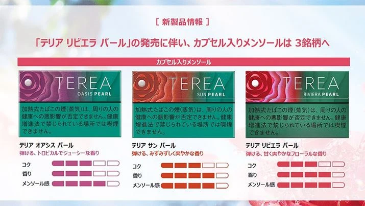 테리아 리비에라 펄. 전국의 IQOS 스토어부터 편의점까지 각 취급점에서 순차적으로 발매됩니다. 가격은 4800원입니다. 해당 제품은 캡슐을 으깨면 신선한 향을 즐길 수 있는 캡슐형 멘솔 타입입니다. 시리즈로는 2023년 데뷔한 테리아 오아시스 펄, 2024년 4월 데뷔한 테리아 썬 펄에 이은 세 번째 제품입니다.