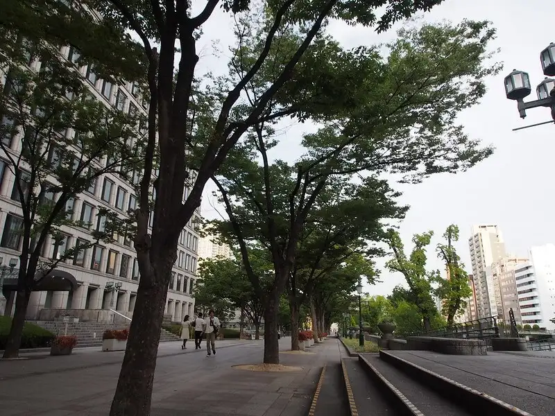 요도야바시에서 히고바시까지 연장 400미터의 나카노시마 녹도는 느티나무, 동백나무, 진달래 등을 감상할 수 있으며, 주변의 중후한 건축물과 함께 아름다운 경관을 보여줍니다.