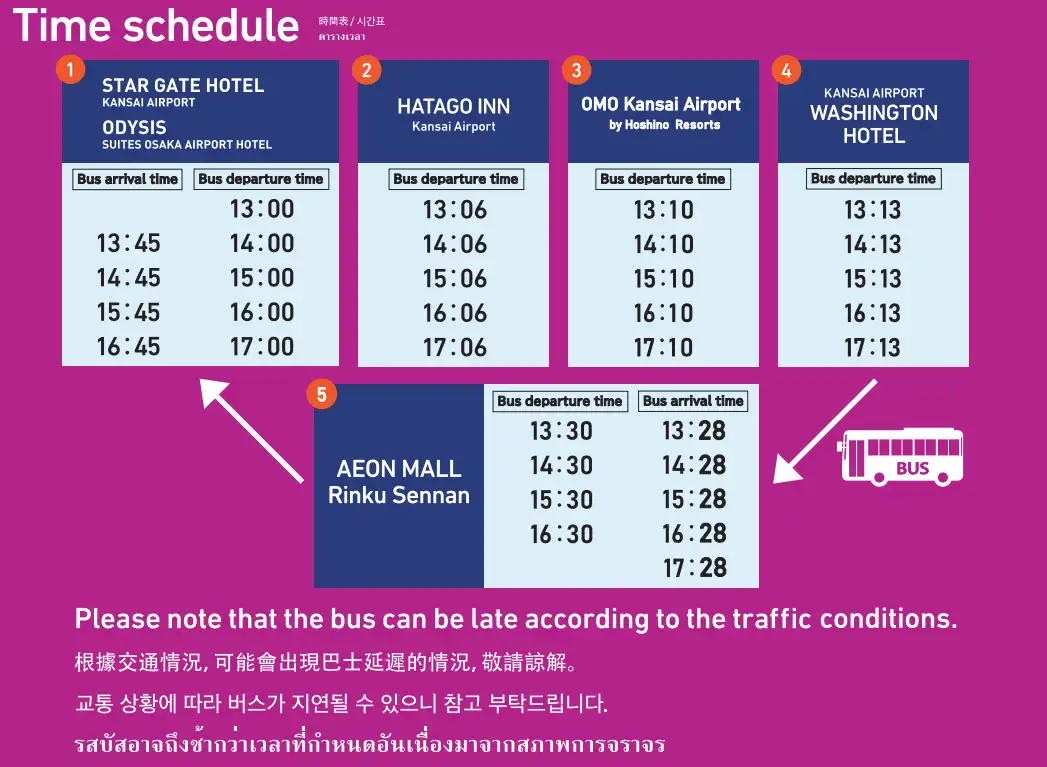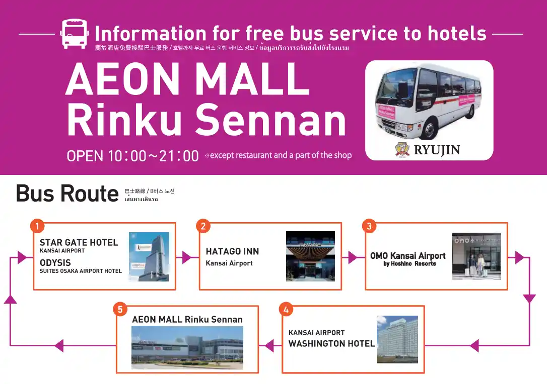 이온몰 린쿠센난과 인근 호텔까지 이동하는 무료 셔틀 버스 정보입니다. STAR GATE HOTEL, HATAGO INN, OMO Kansai Airport, KANSAI AIRPORT Washington hotel, 그리고 이온몰 린쿠센난을 순환합니다.