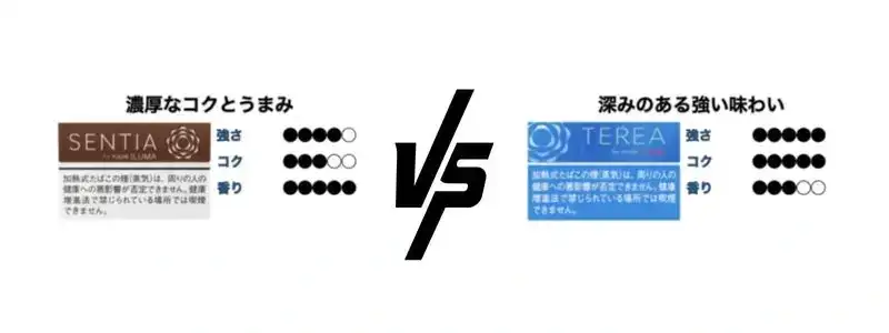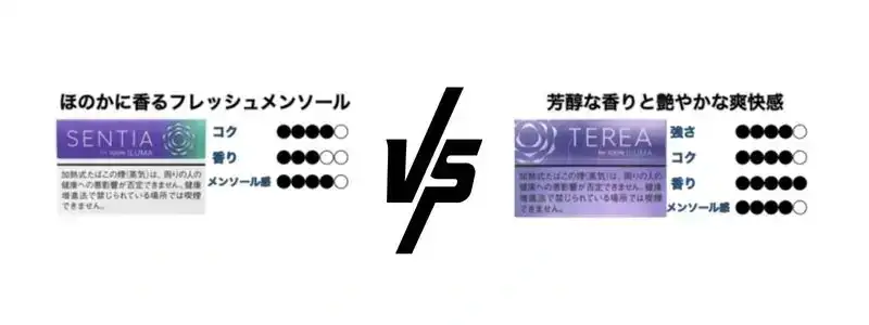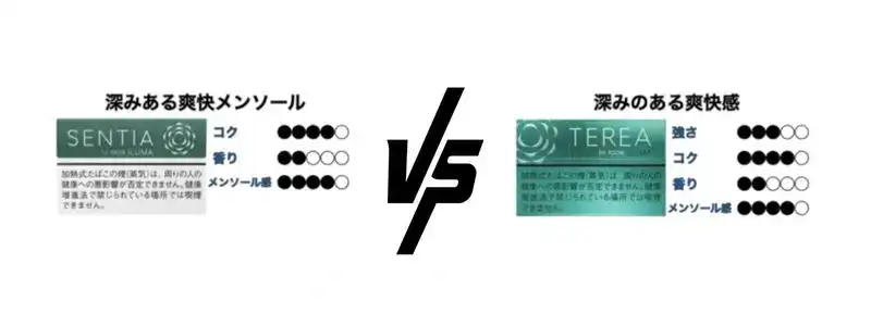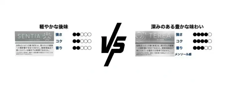 센티아는 입에 부드럽게 닿고 풍미가 풍부합니다. 반면 테리아는 타격감이 강하고 맛이 더 진합니다. 일본에서는 센티아가 일반적으로 테리아보다 저렴합니다. 테리아는 말보로 담배를 사용하지만, 센티아는 히츠 담배를 사용합니다. 테리아에는 21가지 맛이 있고, 센티아에는 14가지 맛이 있습니다.