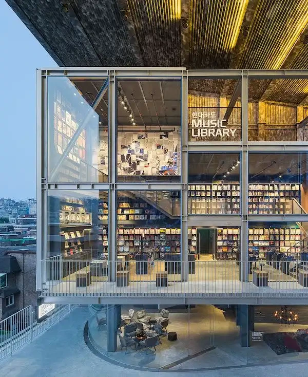 현대카드 뮤직 라이브러리는 한국의 현대자동차 계열 카드사가 운영하는 음악 도서관입니다. 유리로 된 시크한 느낌의 건물은 2층으로 이루어져 있으며, 1층에는 카페가 입점해 있습니다.