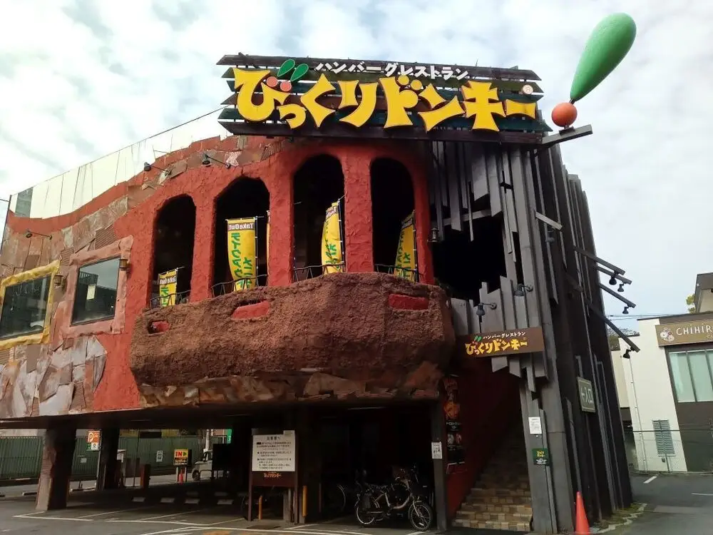 빅쿠리 돈키(びっくりドンキー)는 햄버거 전문 패밀리 레스토랑으로, 햄버거와 라이스 샐러드라는 기본 세트로 제공되는 메뉴가 많습니다. 철판 요리인 스테이크도 제공하고 있습니다.