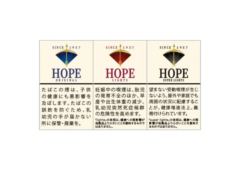 호프의 패키지는 일본 담배 공사의 디자이너 시오즈카 시로 씨가 디자인했습니다. 정면에 크게 배치된 “HOPE” 글자와 로마 신화의 쿠피드가 든 금빛 활과 화살을 모티브로 한 마크가 인상적인 디자인입니다.