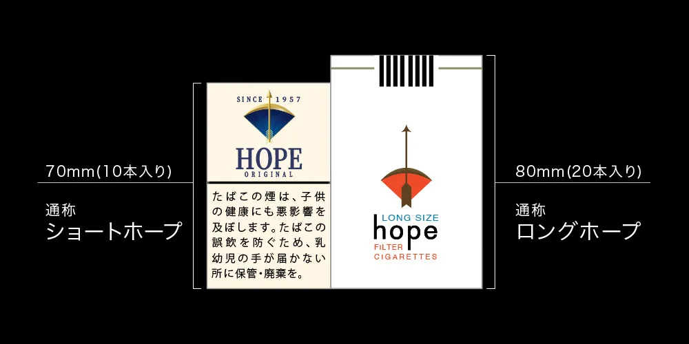 현재 판매 중인 호프 시리즈의 길이는 모두 70mm입니다. 그러나 1964년부터 2002년까지는 이 사이즈 외에도 80mm 정도의 킹 사이즈(롱 사이즈)인 '호프(20개입)'도 판매되었습니다.