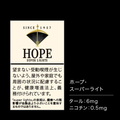 '호프'는 1957년(쇼와 32년)에 일본 최초의 필터 부착 담배로 일본 담배 공사에서 출시된 10개입 종이 담배입니다.