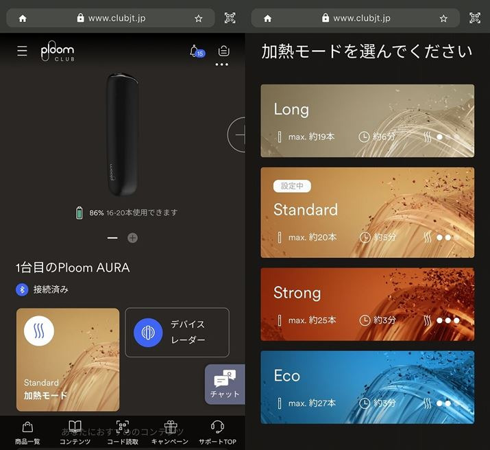 참고로, '히트 셀렉트 시스템'의 4가지 가열 모드를 맛의 측면에서 설명하면 가장 강한 것이 '스트롱 모드'입니다. '스탠다드 모드'와 '에코 모드'의 맛은 동일하며, '롱 모드'는 부드러운 맛을 제공합니다.