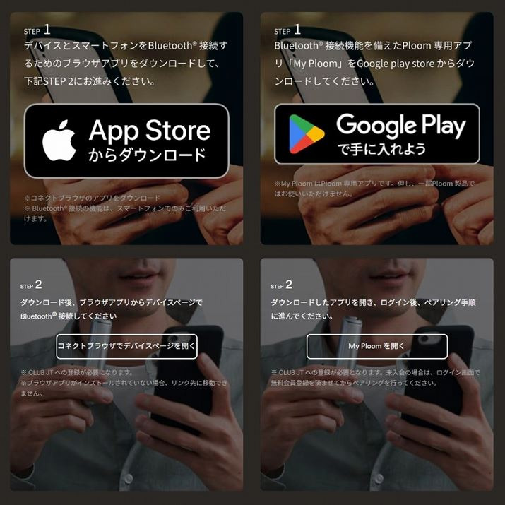 먼저, 스마트폰이 iOS(아이폰)인 경우 '커넥트 브라우저'를, 안드로이드인 경우 'My Ploom'을 다운로드하여 각각 블루투스 연결을 수행합니다.