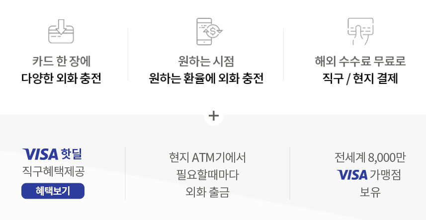 간단하게 장점을 알아보자면, 카드 한 장만 있으면 다양한 외화가 충전이 된다는 점과, 본인이 원하는 시간과 환율에 맞추어 외화가 충전이 가능한 점, 현지 ATM으로 해당 국가의 통화를 출금할 수 있는 점, 해외 결제 수수료가 없다는 점, 컨택리스 결제가 가능한 점 그리고 기타 부가혜택들이 있습니다.