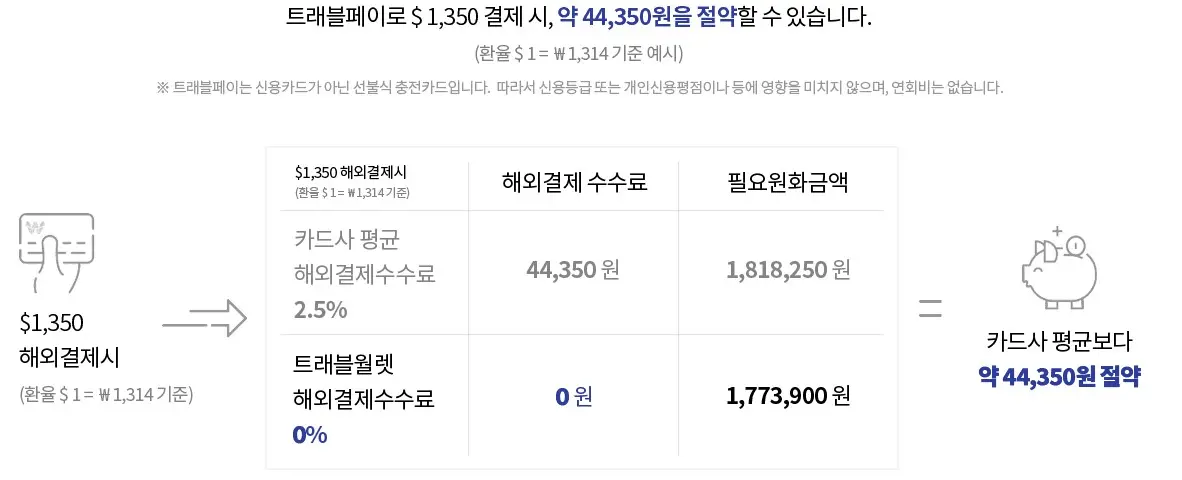 트래블 월렛의 가장 큰 특징이자 장점은 해외 결제 수수료가 없다는 점입니다. 평균적인 신용카드 등을 해외에서 결제로 이용하면 2.5% 정도가 소요되는 데 반해 트래블월렛은 무료이다보니, 알게 모르게 절약이 되는 경우가 많습니다. 이번 표에서 예시로 가져온 $1,350 (현재 원화로 약 1,500,000원 정도)를 해외에서 이용한다면, 트래블월렛은 44,350원을 절약할 수 있습니다.