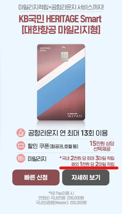 하지만, 트래블 월렛을 사용하면 손해를 보는 경우도 있습니다. 예로, KB국민 HERITAGE Smart나 롯데 더드림 같은 프리미엄 카드를 이용중이시라면 해당 카드를 사용하는 편이 이득입니다. 위 카드를 이용하면 해외에서 결제 시 1 천원당 2마일이 적립됩니다. 적립되는 마일리지는 보통 1 마일리지당 15~20원 정도의 가치가 있기 때문에, 15원이라고 계산해도 훨씬 이득입니다.