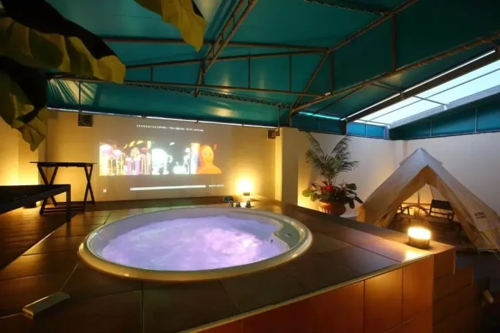 주목할 점은 야외 자쿠지와 100인치 프로젝터를 설치한 초호화 스위트룸! 텐트까지 설치되어 있어 글램핑 분위기도 느낄 수 있습니다.