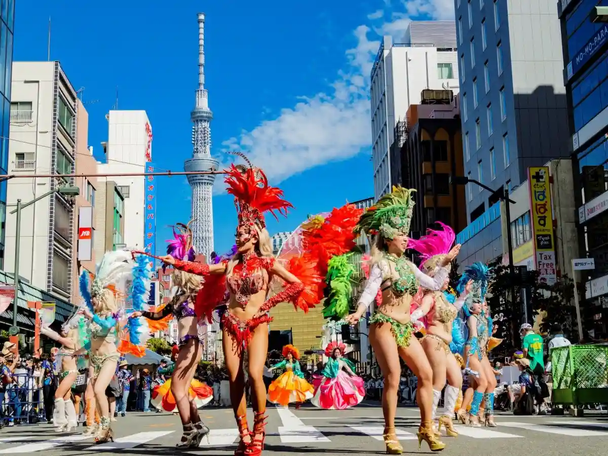 올해로 40회째를 맞는 아사쿠사의 여름 풍물시. '북반구 최대'로 불리는 이 카니발에는 매년 약 50만 명의 관객이 모입니다. 열정적인 바테리아 팀의 리듬에 맞춰 화려한 댄서들이 우아하게 춤을 추며, 본고장 리우데자네이루를 연상시키는 열기로 가득 차 있습니다.