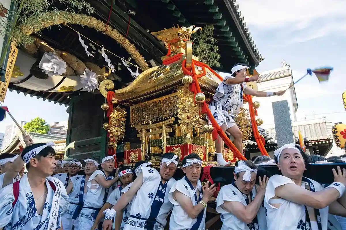 약 2톤의 대형 신여를 메며 “베라, 베라!”라는 용감한 구호가 길가에 모인 관객을 매료시킵니다.