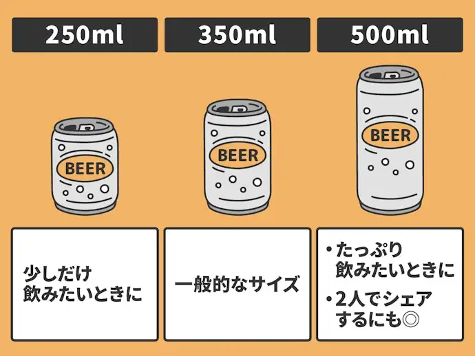캔 맥주를 구매할 때는 사이즈도 고려해 선택하세요. 가장 많이 판매되는 일반적인 캔 맥주 사이즈는 350ml로, 별생각 없이 항상 이 사이즈를 구매하고 계신가요? 사실 캔 맥주는 의외로 다양한 사이즈가 있으니, 마시는 상황에 따라 바꿔보는 것도 추천합니다.
