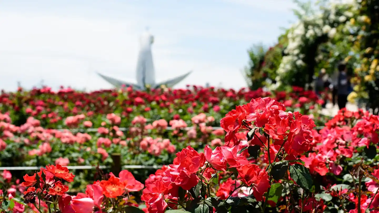 특히 5월 중순부터 하순까지는 약 2,400그루의 장미가 절정을 맞이하여 다채로운 꽃들이 공원을 물들입니다. 자연을 만끽하면서 1970년 오사카 만국박람회의 역사도 느낄 수 있는 귀중한 장소입니다.